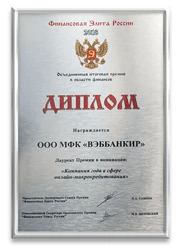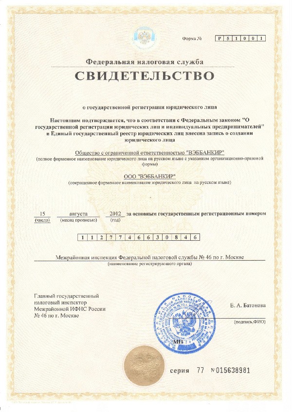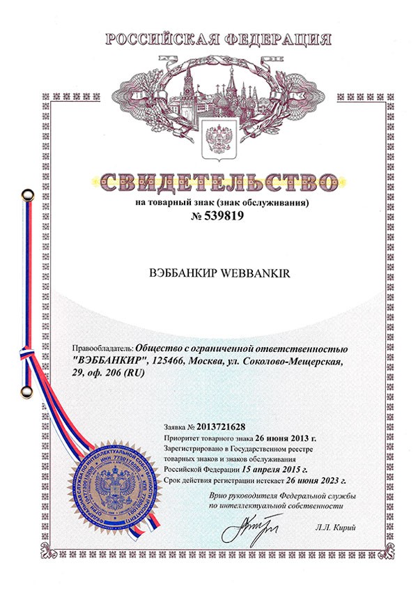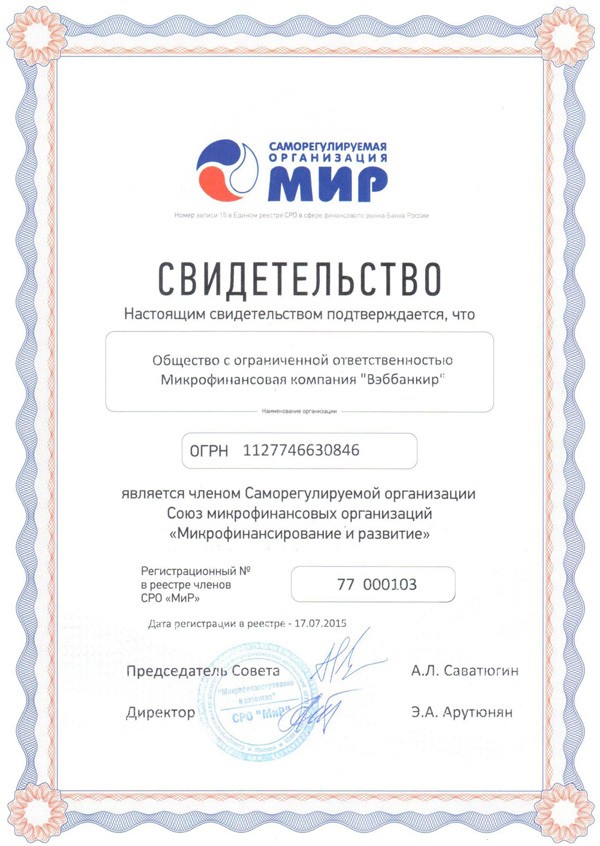 ВЭББАНКИР работает в соответствии с Федеральным законом №151-ФЗ «О микрофинансовой деятельности и микрофинансовых организациях» от 2 июля 2010 года и включён в государственный реестр МФО (свидетельство №2120177002077).